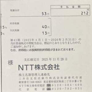NTTより配当金212円入りました。(100株)